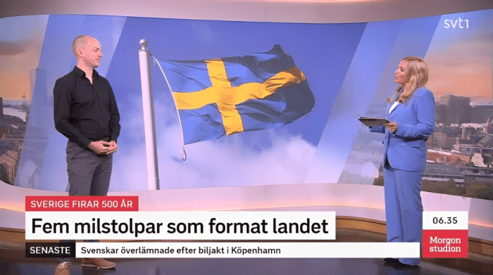 GETTING PREPARED TO CELEBRATE: Tomorrow it’s time to celebrate Sweden’s 500 years on this special National Day, marking the day Gustav Vasa was elected king. To mark this significant occasion, Erik Petersson appeared on Swedish Television’s morning show, “Morgonstudion,” where he discussed five pivotal milestones, one per century, highlighting significant events that have shaped the country’s journey up until today. Get ready for an exhilarating exploration of Sweden’s rich history and its remarkable evolution throughout the ages!
